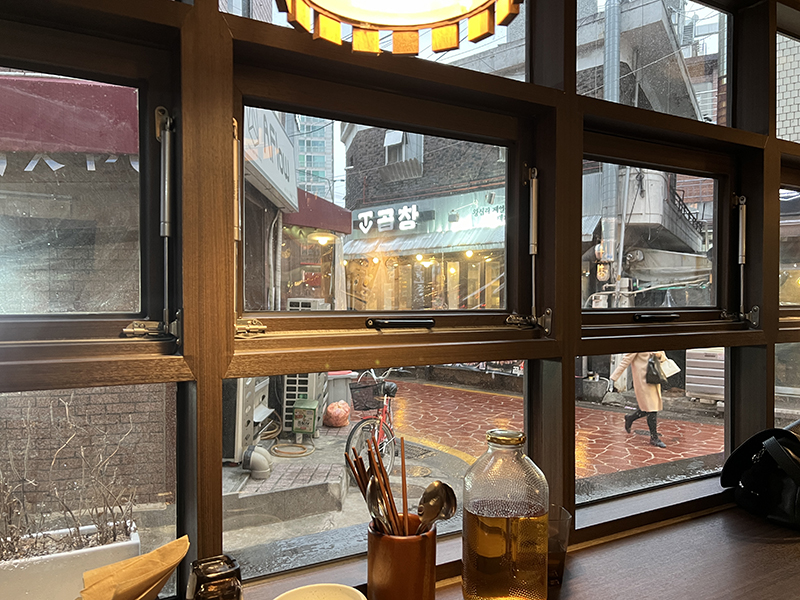 창가 자리에 앉았다 자리마다 티슈 컵 앞접시 수저 물